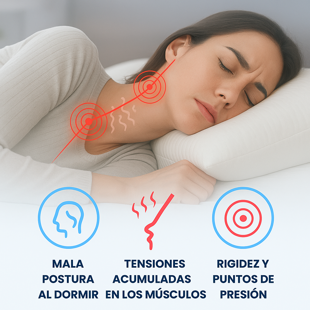Una almohada muy alta, muy baja o de mala calidad obliga a los músculos cervicales a trabajar toda la noche. La columna se desalinea, aparecen puntos de presión y te despertás contracturado, como si no hubieras descansado.