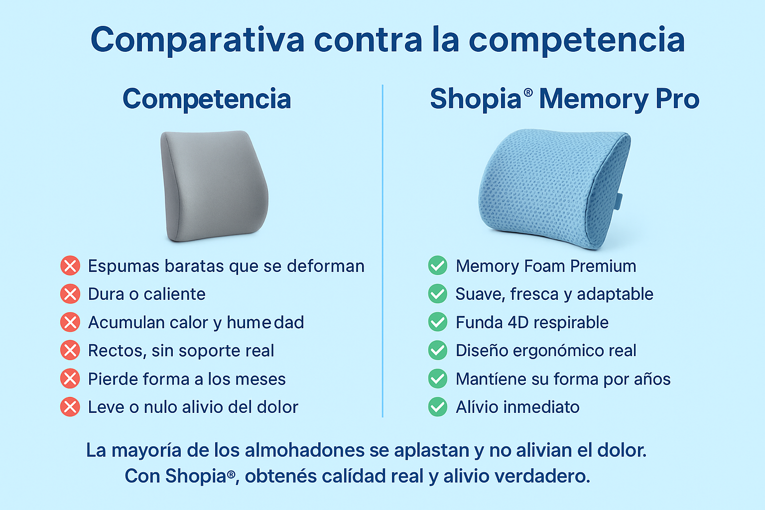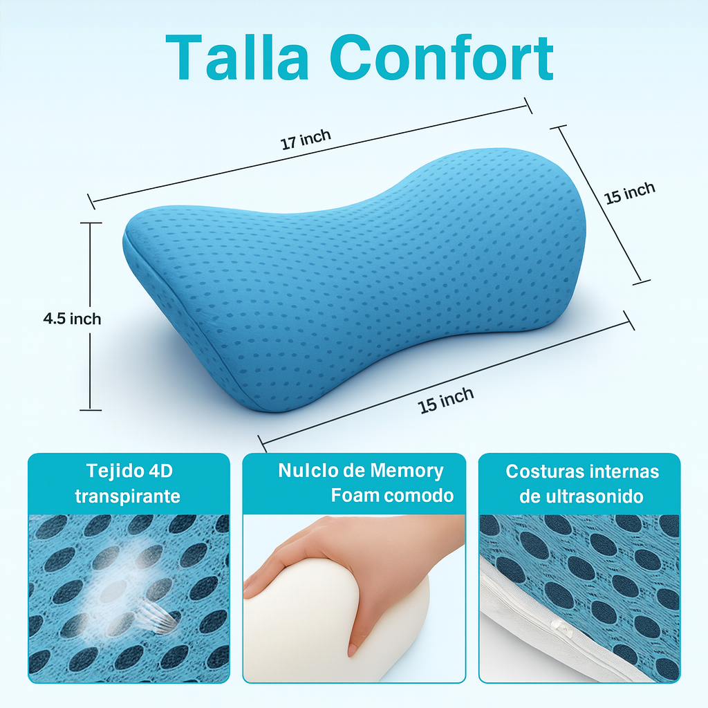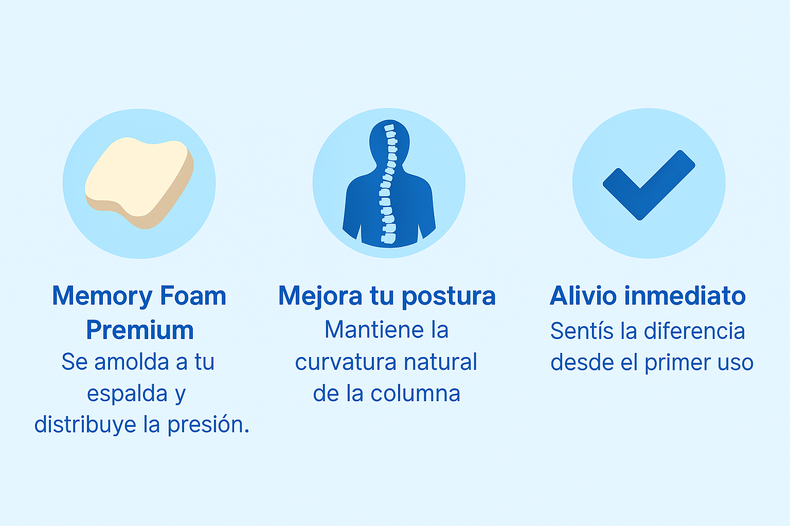El Almohadón Lumbar Memory Pro se adapta a la forma natural de tu espalda, rellenando el hueco lumbar y reduciendo la presión que causa dolor y tensión. No es una almohadita común: es soporte ergonómico real.